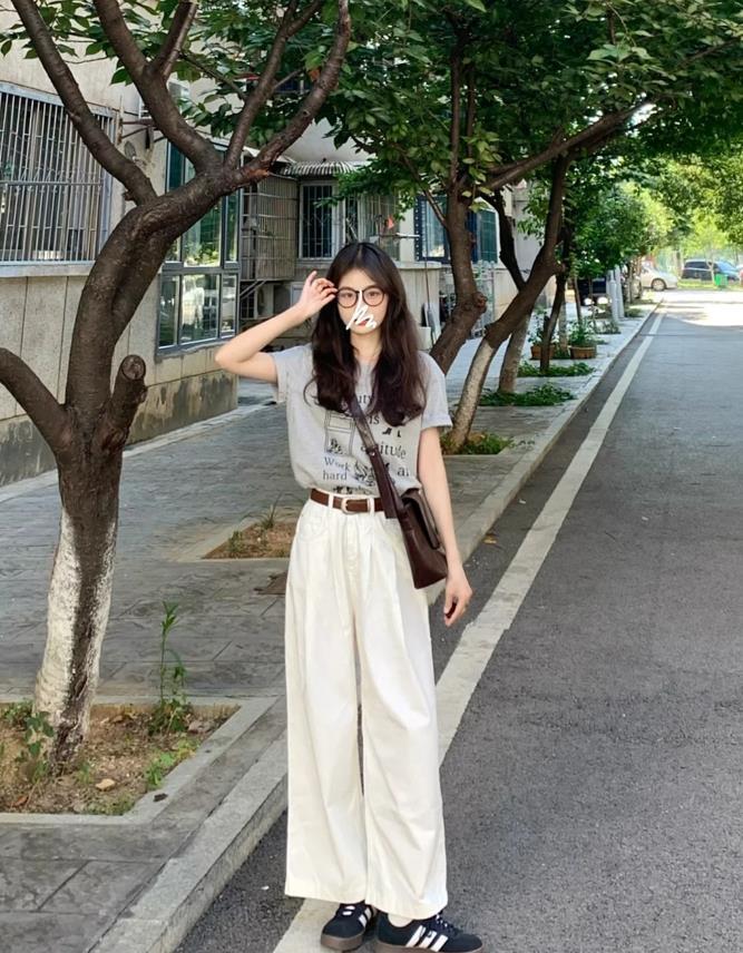 腿粗又有什麼關係呢?只要你穿上闊腿褲就什麼都不用擔心了,白色牛仔闊腿褲,這種褲子的材質很佳,所以垂墜感是極其好的。上衣簡單配一件t恤就行,黑色或者白色都可以,怎麼搭配都好看。