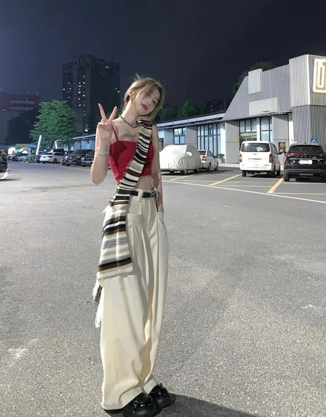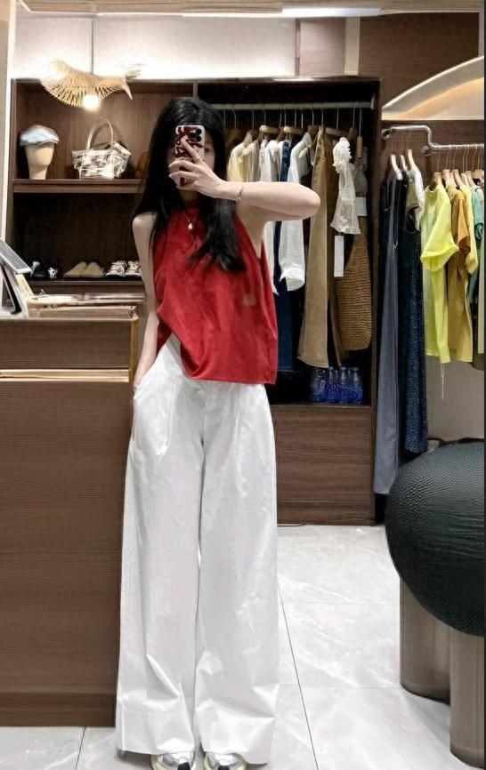 當你穿膩了黑色西裝闊腿褲,那麼就爲自己入手一條白色西裝闊腿褲吧,寬鬆的褲型,也太藏肉顯瘦了,加上高腰的設計,可以輕鬆拉長腿部線條,上衣配一件紅色背心,這麼穿也太涼快了,還充滿了小性感。