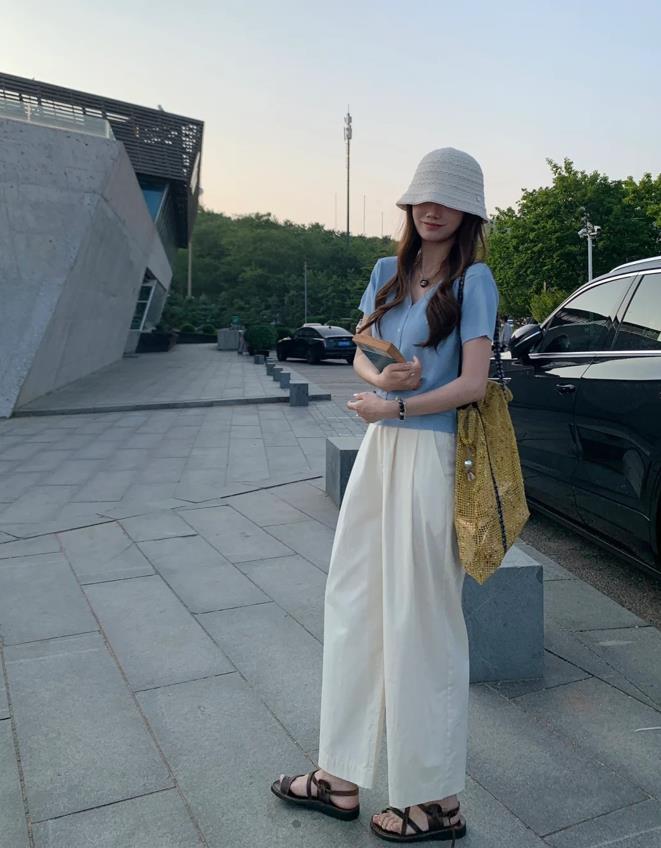 夏天就是要選擇顏色乾淨一點的衣服來穿,例如白色和藍色,這麼一整套看起來也太清爽涼快了,低飽和度的藍色針織短袖,柔軟舒適又透氣,搭配白色直筒闊腿褲,顯瘦效果可太好了,最重要的是不挑身材。