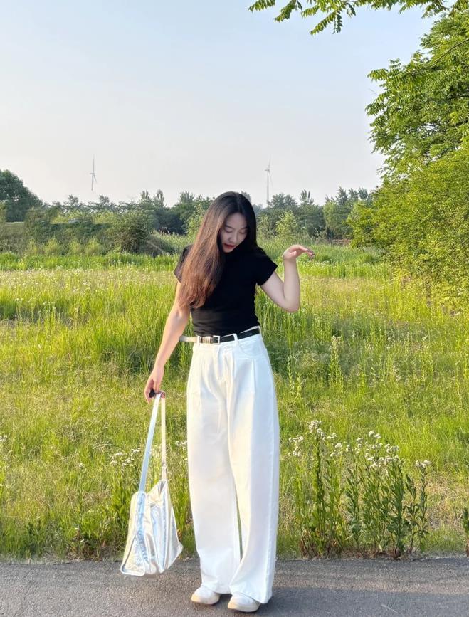 鬆弛感的穿搭,就是能打造出毫不費力的隨性感,白色亞麻闊腿褲,喜歡這種面料,透氣性真的是極佳的,不僅能讓你穿得舒適自在,還很藏肉。搭配黑色短款t恤,上短下長的組合,有助於優化整個身材比例,黑白配色更是顯時髦。