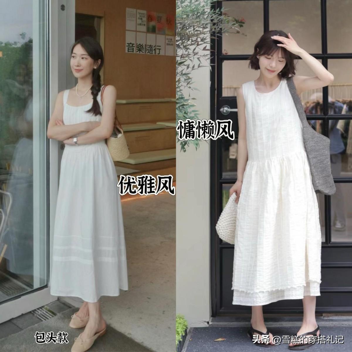 慵懶風的白色背心裙,配黑色人字拖會顯得更加灑脫鬆弛,經典簡約的黑白配,再背上一款灰色單肩包,穿多久都不會過時。