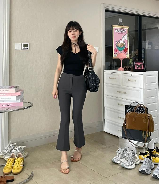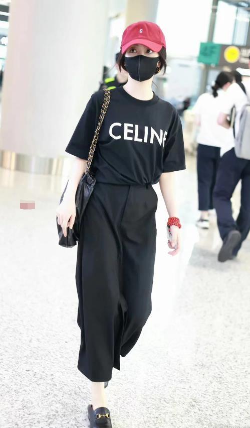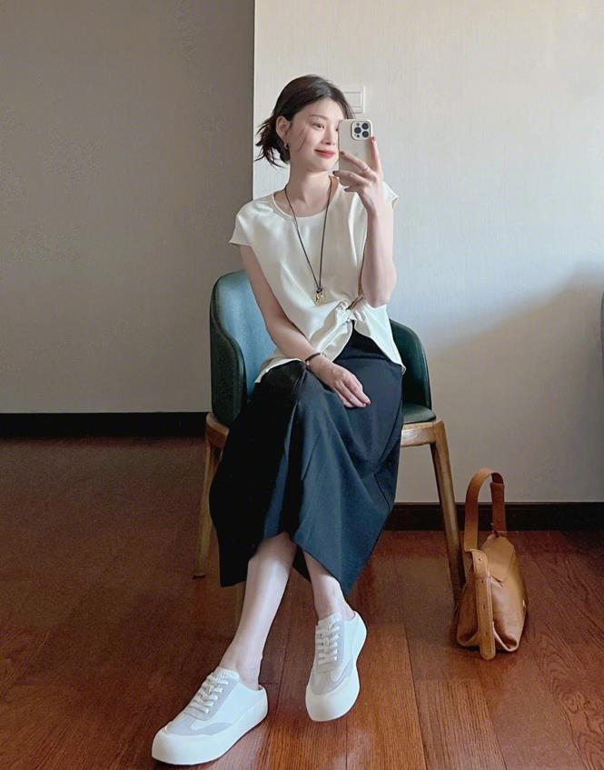 這種穆勒鞋也是半拖鞋的一種,黑色的穆勒鞋,還帶點跟的款式,穿起來並不會累腳,反而是會給人一種顯腿長的效果。譚松韻這一身黑色系的打扮,看起來就非常高級,黑色短袖t恤配黑色半身長裙,休閒又舒適。