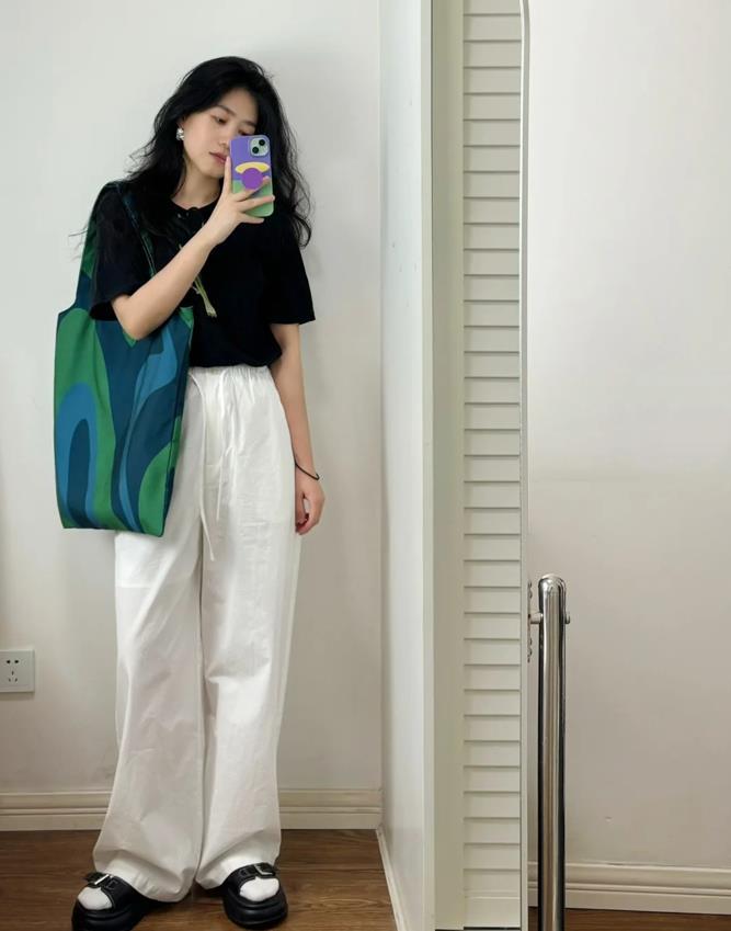 黑白配的穿搭,就是有種很時髦耐看和高級感,黑色寬鬆短袖t恤+白色休閒闊腿長褲,這麼一套組合在一起,鬆弛又不失隨性。就算是腿粗的身材,也是可以穿的,腳下黑色厚底涼鞋,可以單穿,也可以結合襪子來穿,很不失層次感。