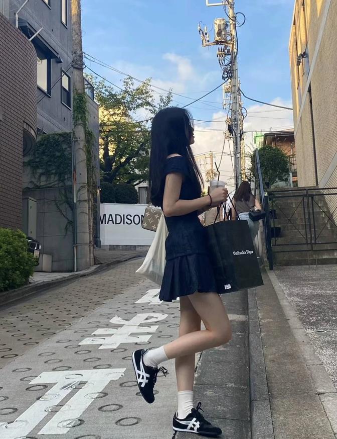 黑色的運動鞋,和白色一樣,都是非常百搭的,在夏季,運動鞋的材質建議選擇透氣性好一點的,很輕便的款,搭配裙子也好看,可以利用起一雙白色襪子來配,增加造型層次,關鍵時髦。