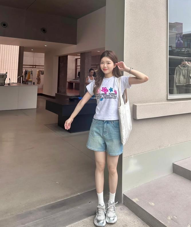 夏日舒適又涼快的一套逛街穿搭,基礎款t恤配牛仔短褲,再穿上一雙運動鞋,這麼一套看起來就非常舒適,腿型比例好的姐妹,就可以這麼穿,就這麼露出大部分腿部線條,也太清爽涼快了。