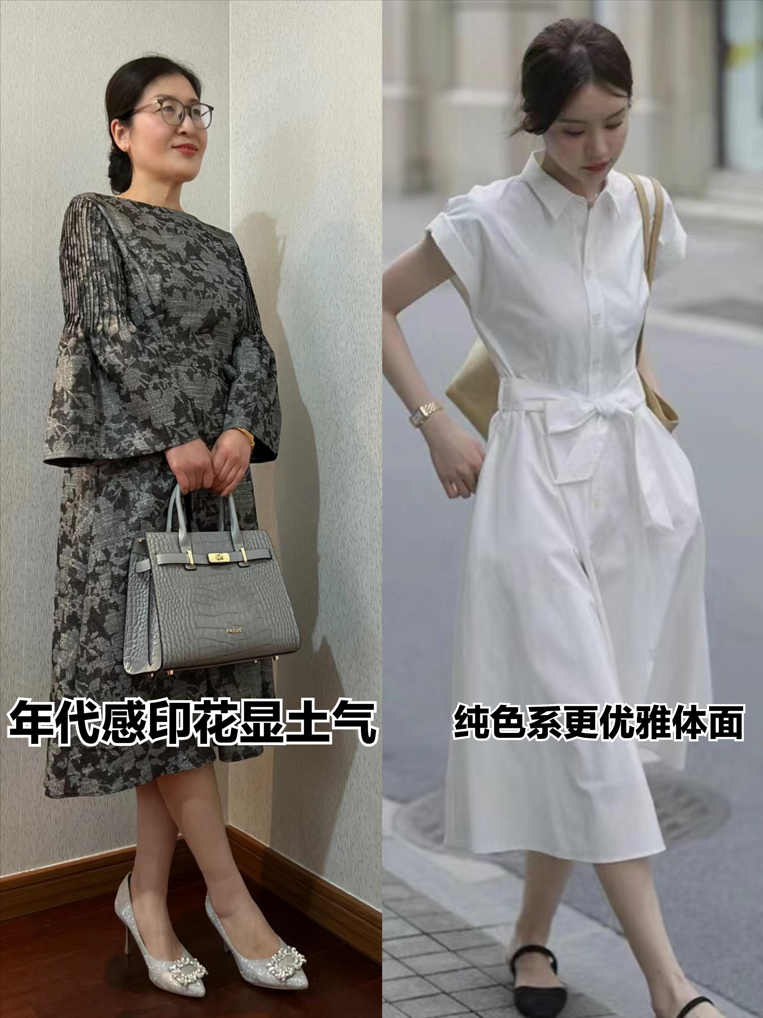 五六十歲的年紀,穿上歲月感明顯的印花連衣裙,無形中增加了老態,不如純色系連衣裙更大方提氣質。