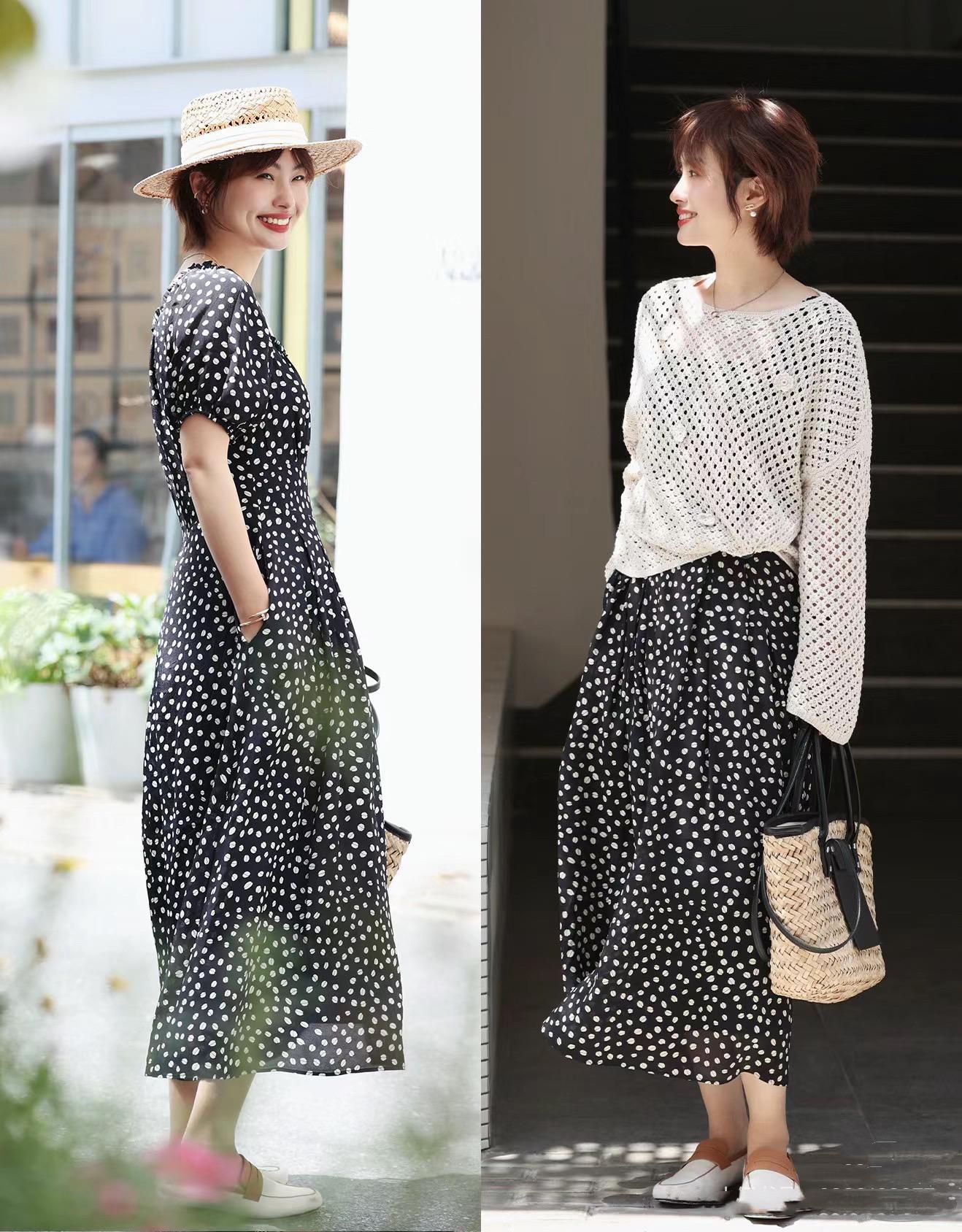 夏天裏的波點,怎麼穿都不會膩。而黑白色的波點,也是波點元素中的經典款式。面料飄逸的波點連衣裙,擁有法式風情的浪漫。