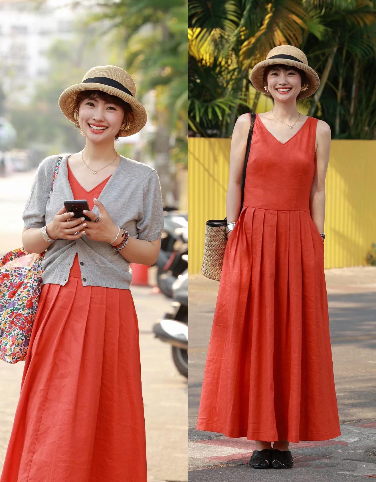 磚紅色的連衣裙,色彩飽和度和明亮度都超高,有一種醒目顯白的美、也很提氣色。