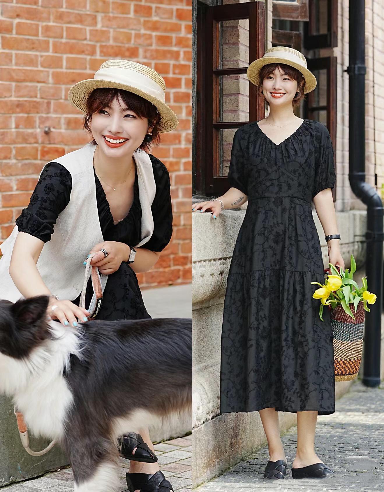 黑色提花連衣裙,搭亞麻質地的米白色襯衫,透着輕盈溫和的力量,大方自信。