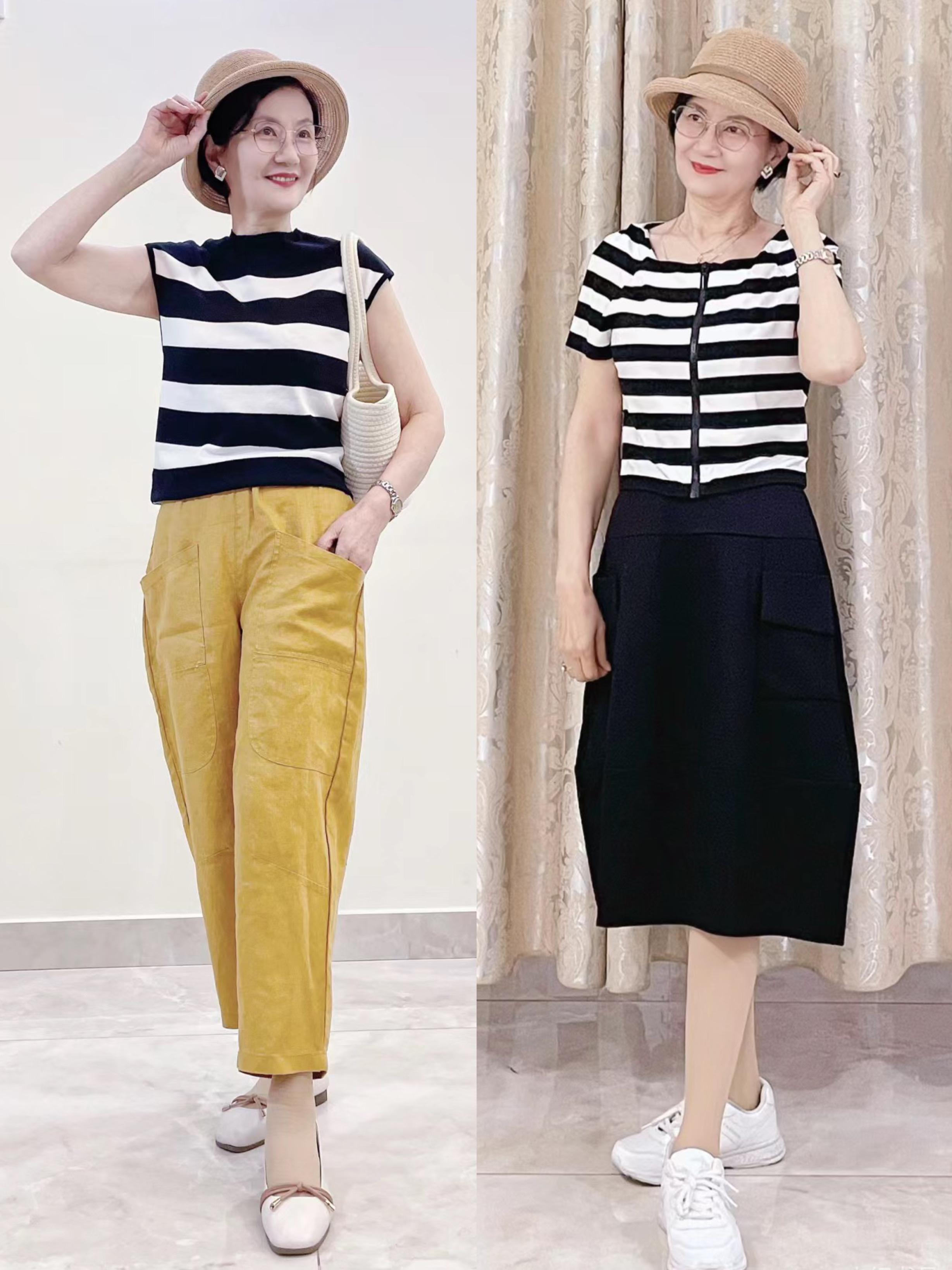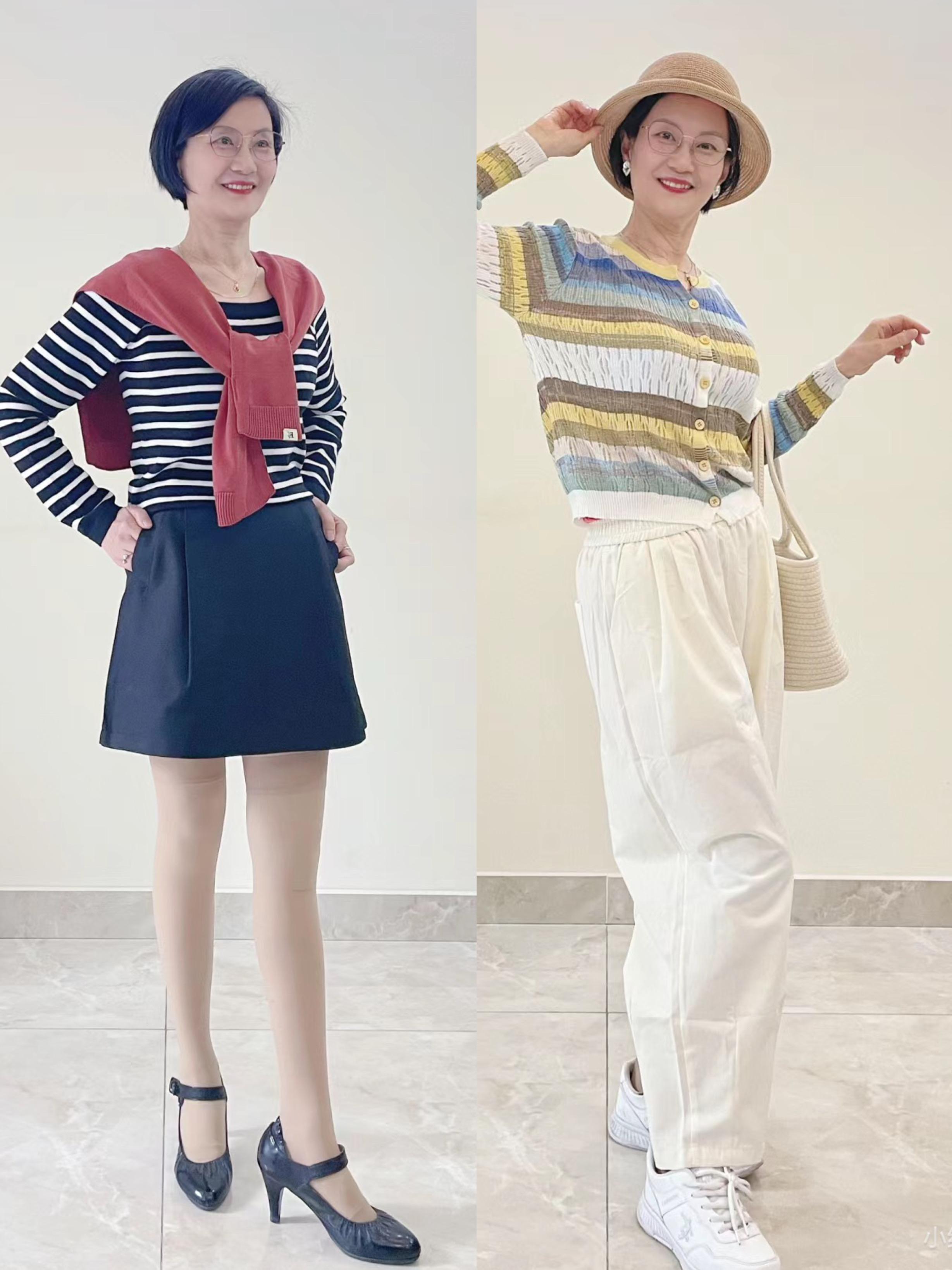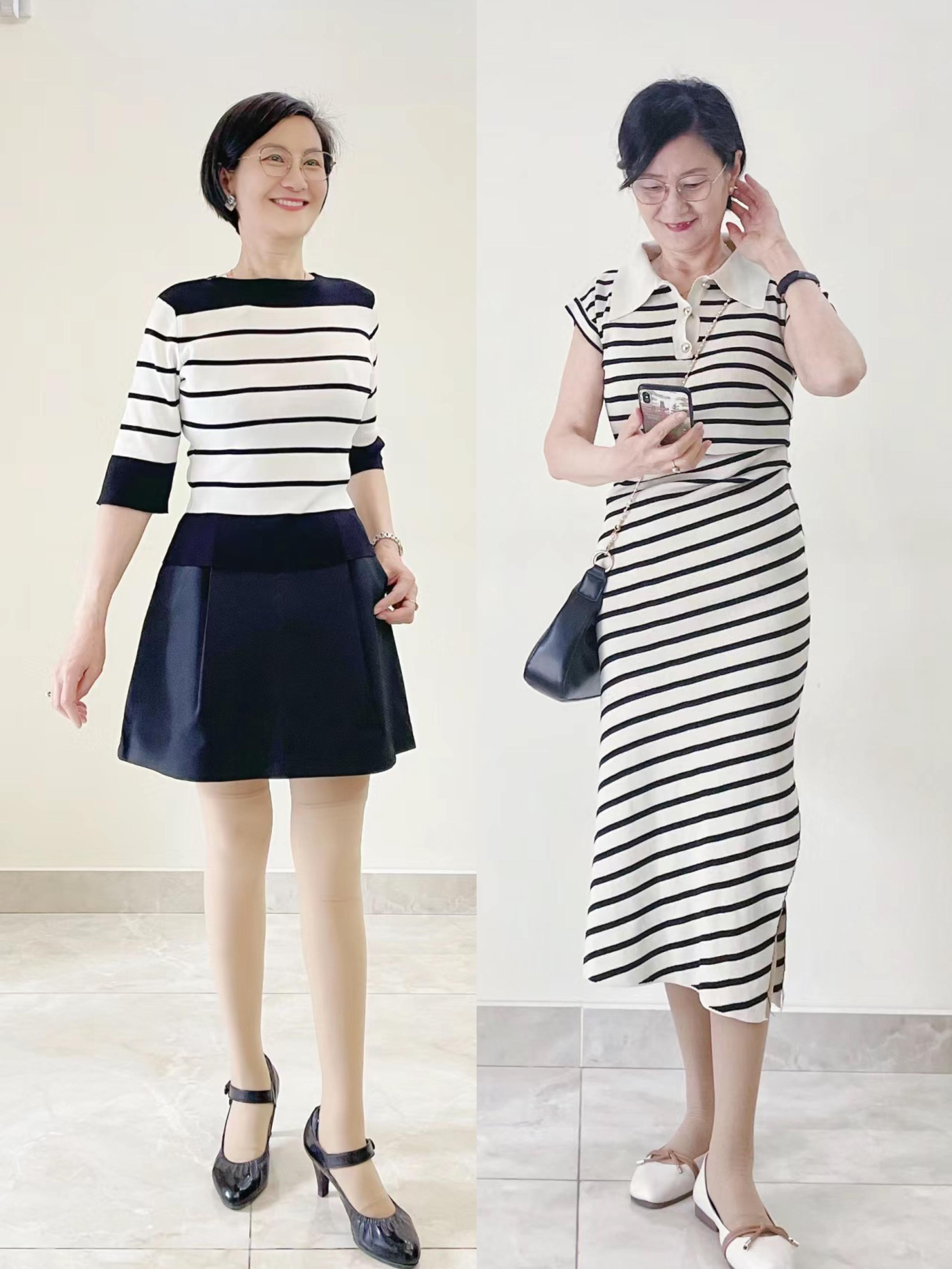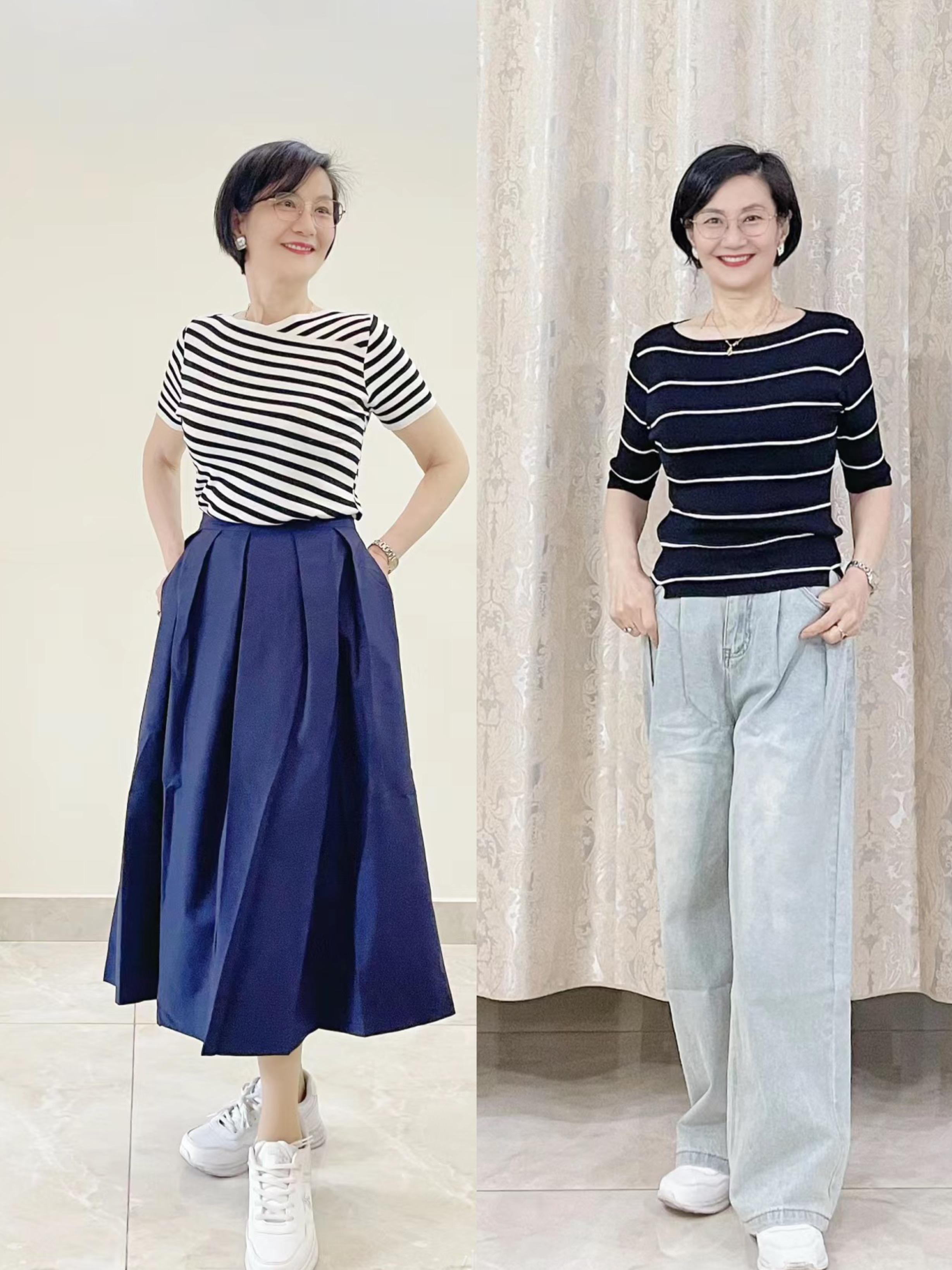 年紀偏大的人羣,擔心穿花色鮮亮的服裝會顯得又土又老氣,我們可以嘗試經典的條紋元素。