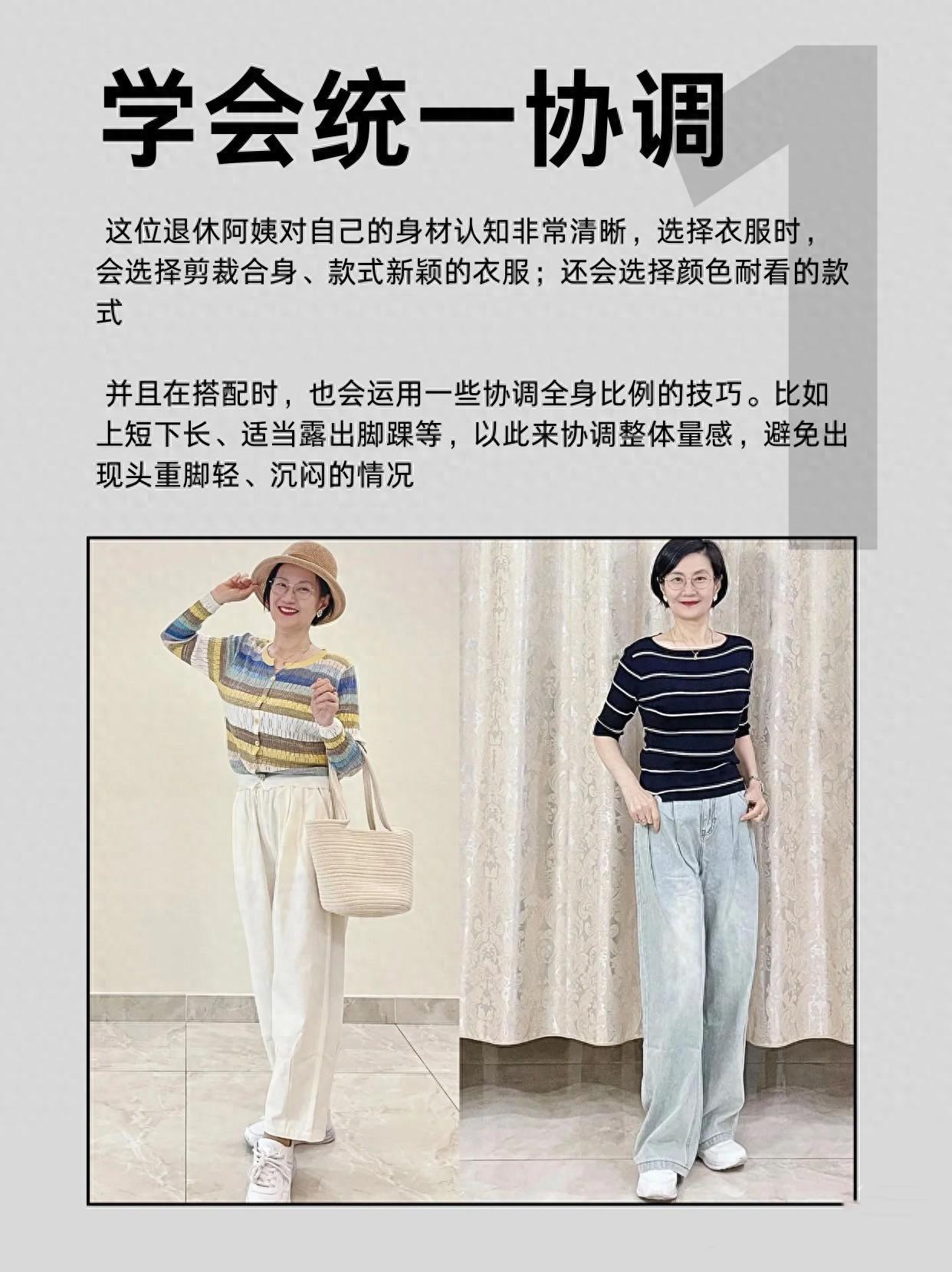 其實看這位阿姨的穿衣搭配,就能總結一定的技巧。