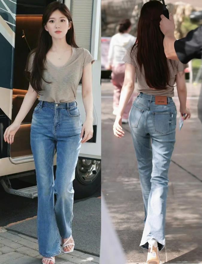 趙露思也是一位神仙女孩啊,她的穿搭也是很具有參考價值的,就算是普通人都能輕鬆駕馭,薄款的短袖t恤,一定要記得在裏面多加一件小背心之類的,這樣就不用擔心會暴露啦,下身是一條牛仔微喇褲,這麼穿也太氣質了,也超級顯腿長!