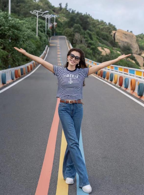 夏季40歲的女人就跟着劉濤學穿搭吧,在這樣一個年齡段裏,衣服的款式儘量從簡,因爲越簡單越時髦。藍白條紋短袖t恤+微喇牛仔長褲,上短下長的組合,實在是太修飾身材了,也能將下身的比例拉得很修長。