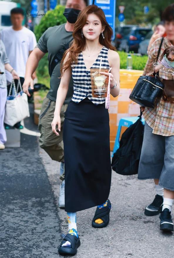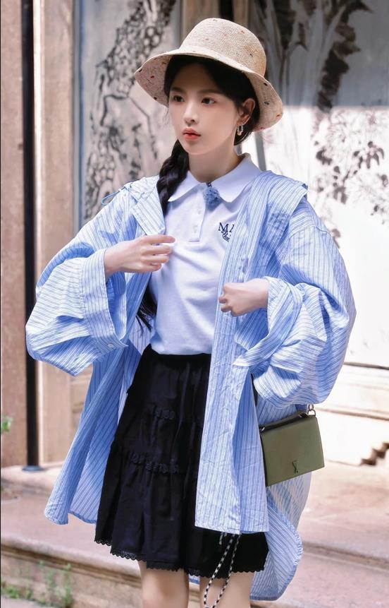 清爽乾淨的藍白配色,真的是最適合夏天了,看楊超越身上穿得這件藍色條紋襯衫,寬大的版型,也太不挑人穿了,裏面是一件白色polo衫,加上一條黑色半身短裙,一整個青春洋氣的模樣。
