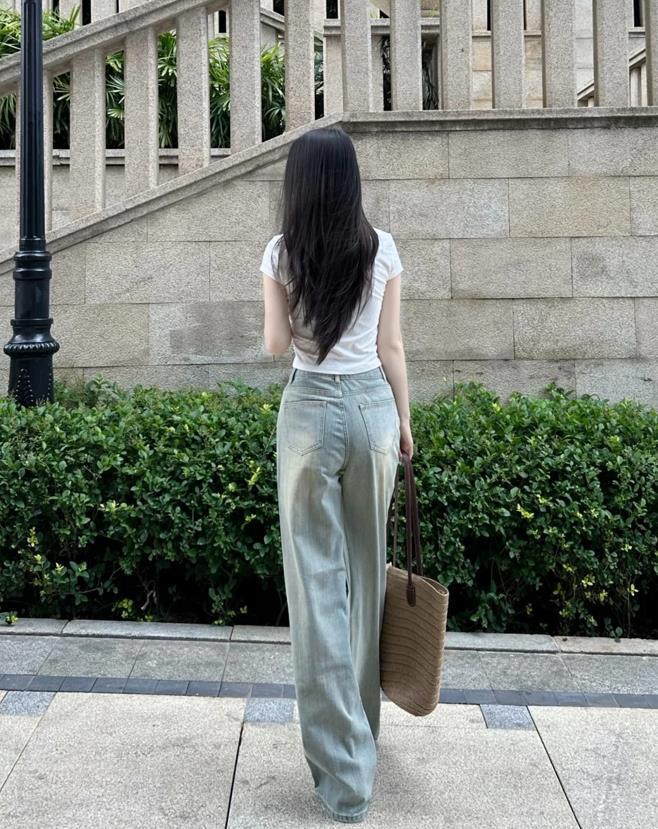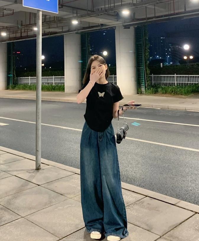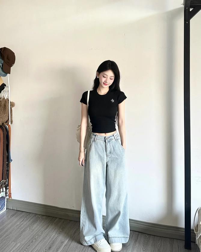 黑色修身短款t恤,這簡直是小個子女生的專屬啊,微微露腰的設計,既帶些小性感,還能很好提高腰線比例。下裝搭配一條水洗牛仔闊腿褲,這種帶點垂墜感,又有些拖地的長度,可以把雙腿拉得很修長。既不失日常又顯瘦的一套。