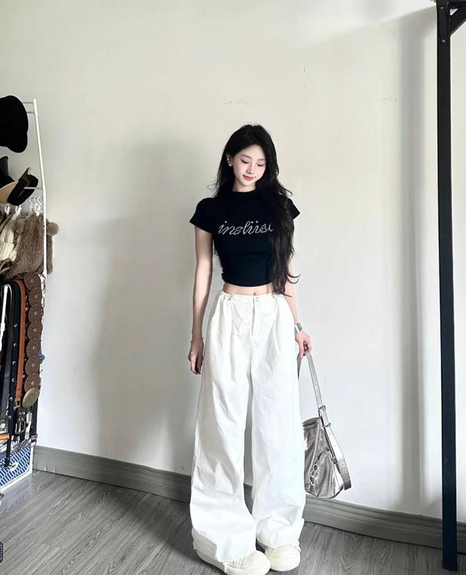 這一套完全是我喜歡的穿搭,黑色正肩t恤搭配白色工裝闊腿褲,非常顯日常又顯瘦的一套,整體看起來酷辣酷辣的,喜歡這條褲子,穿起來可舒適自在了,搭配一雙與褲子同色的運動鞋,休閒極了。