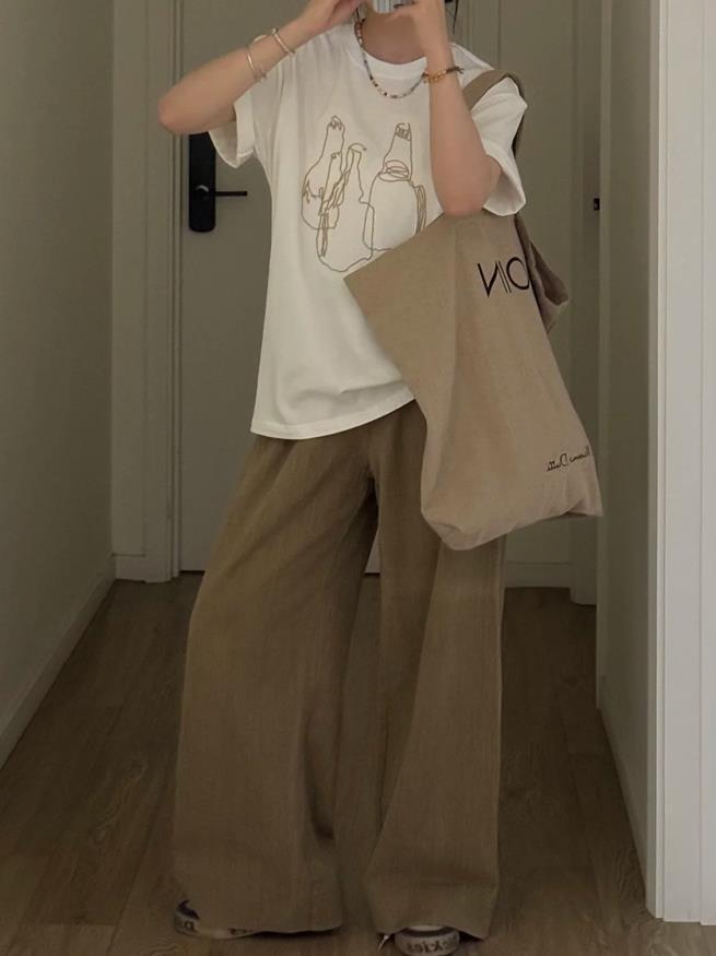 白色正肩短袖t恤,這個顏色很適合夏天,自帶降溫效果有沒有?關鍵是很百搭清爽,下身搭配的是一條亞麻材質的闊腿褲,舒適度極佳的,也非常透氣,當然了,它的垂墜感也是很讚的。