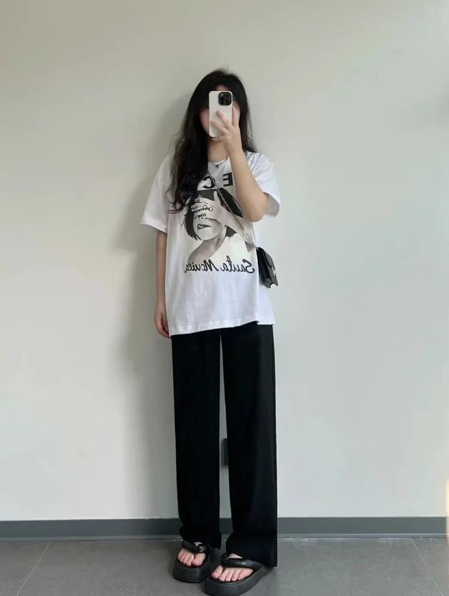 一件寬鬆的大t恤,在夏天穿起來可太舒適自在了,也很清爽涼快,毫不費力就可以穿出時髦感,下裝配的是一條黑色闊腿褲,上下都寬鬆的組合,也太隨性自在了,關鍵是顯瘦。