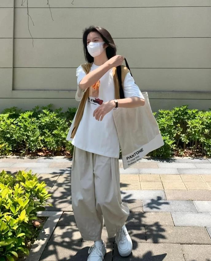 今年正肩的t恤似乎挺流行的呢,不過我覺得這種t恤比較適合骨架小的身材穿,加上修身的版型,可以把身材勾勒得很完美。搭配寬鬆的闊腿褲,腳下再踩着一雙白色運動鞋,休閒隨性又顯瘦。