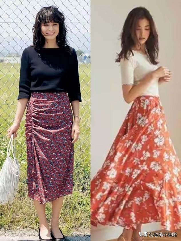 當我們去嘗試穿碎花裙的時候,一定要明確一個繁簡相稱的原理。日本雜誌模特就是這樣去實踐的最好的搭配方式,就是用一件純色的T恤組合半身的碎花裙,可以很方便的把你的視覺焦點往下放,但是腰線的劃分又不會影響你身材比例的展示。