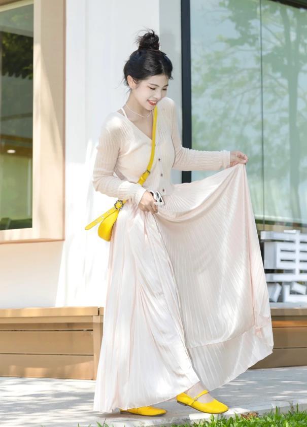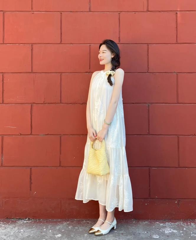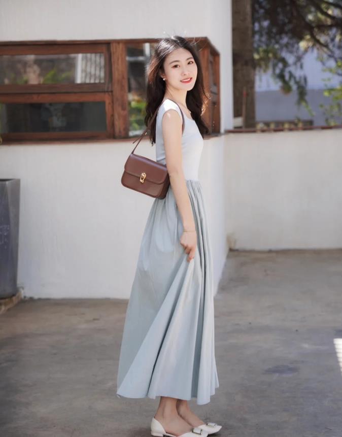 氣質長裙真的永遠都穿不膩啊,baby藍色,可太溫柔和氣質了,也非常襯膚色和顯白,收腰的設計,能完美勾勒出纖細的身段。裙子的長度在腳踝左右,一點都不會壓個子,反而能很好遮掩住身上的缺點。選擇一雙白色平底單鞋來配,可舒適自在了。