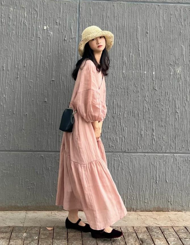 小個子也可以駕馭的一款連衣長裙,春夏秋季節都可以穿,雖然是長袖,可人家的面料是亞麻材質,透氣性和舒適度都極佳的。加上寬鬆的裙身版型,最藏肉顯瘦了,腳下踩着一雙黑色平底鞋,美麗又舒適。
