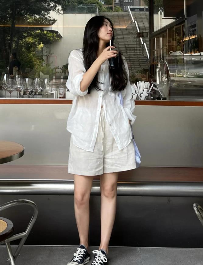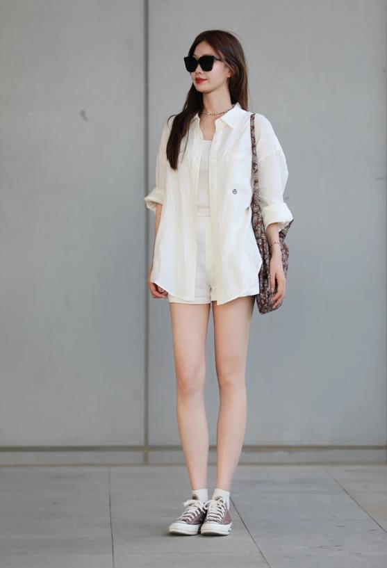 鬆弛感的穿搭,真的沒有誰會拒絕的,特別是在夏天,衣服簡單一些,配色簡潔大方一點,版型也寬鬆些,這樣才能穿得更舒適自在。白色襯衫+短褲,很適合小個子女生的穿法,就這麼露出腿部線條來,視覺上能起到很好的拉長效果,清爽又顯高挑。