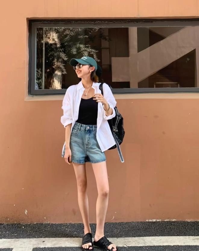 這一套我實在是太愛了,白色基礎款襯衫+牛仔短褲,很不失日常的組合,簡單高級又帶點酷颯感,特別適合小個子女生穿,出門可以隨意配一雙涼拖鞋,清爽隨意又自在,輕鬆就能打造出大長腿的效果。