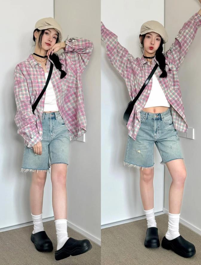 少年感十足的一套穿搭,格子襯衫,復古氣息滿滿的,今年正流行這種款式的襯衫,與牛仔五分短褲相配,鬆弛感兼顧了,也很時髦舒適。