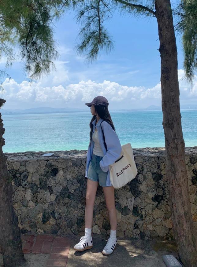 藍襯衫和牛仔短褲的搭配,夏天這樣穿着出門逛街,或者是去度假都好好看啊,建議把襯衫直接當防曬衣來穿,這樣就不用擔心會被曬黑了,鞋子的話選擇一雙運動鞋,加上一雙襪子外露,很好打造出層次感。