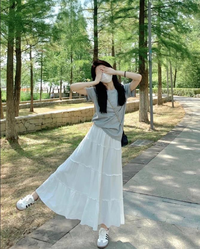 白色半身長裙,真的是自帶仙氣感啊,裙子的版型是傘字形狀的,可藏肉顯瘦了,對於梨形身材特別友好。上衣搭配一件灰色基礎短袖t恤,這兩種簡約單品組合在一起,就是非常耐看,再配上一雙白色運動鞋,青春活力感十足。