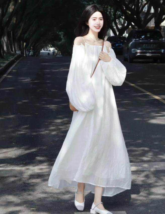 真的好喜歡這一條白色連衣長裙啊,自帶乾淨氣息,還不失仙氣感,寬鬆的裙身,給足了身材包容性,顯瘦藏肉的效果都是非常不錯的。輕盈材質的裙子,可舒適自在了,腳下踩着一雙白色平底單鞋,和裙子顏色一致,和諧又高級。