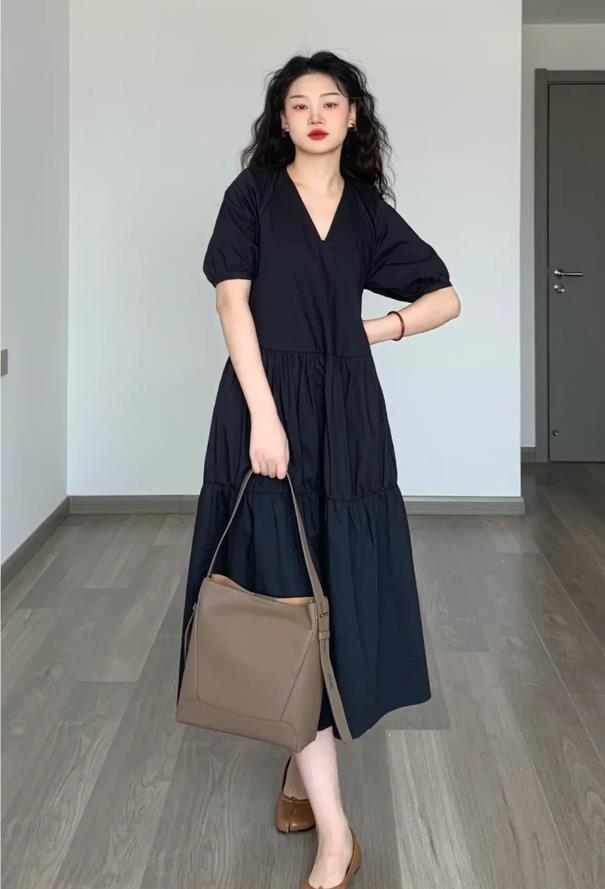 小黑裙可是時尚圈裏永不過時的裙裝之一,深v領口的設計,對比起圓領要好看太多了,視覺上就非常顯瘦。寬鬆的裙身,給足了你身材包容性,也非常藏肉顯瘦,搭配平底鞋,加上一個通勤包,上班約會逛街都很舒適自在。