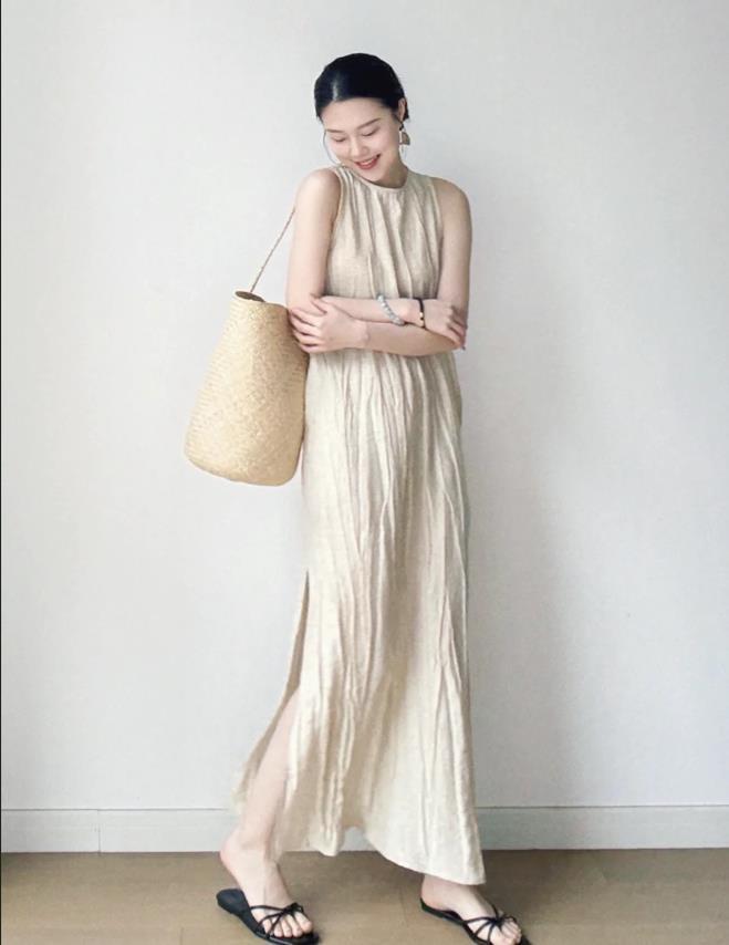 在夏天,真的很喜歡穿這種無袖連衣裙,記得要選擇裙子長度長一點的,到腳踝左右位置最佳,能很好在視覺上拉長身形比例。寬鬆的裙身,可藏肉顯瘦了,出門隨便搭配一雙平底涼拖鞋,很好營造出一種輕鬆自在的氛圍感。