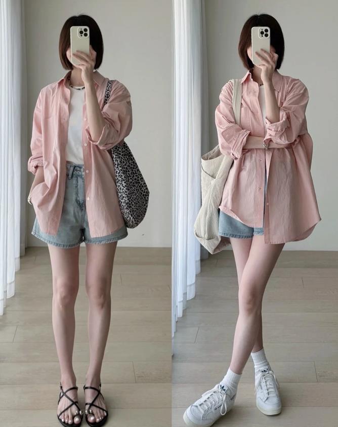 粉粉嫩嫩的襯衫,試問誰會拒絕呢?反正我是超愛的,輕薄材質的粉色襯衫,透氣性極佳的,可以單穿,也可以在裏面配上一件白色t恤或背心,再搭配一條牛仔短褲就可以出門了,清爽涼快又能在視覺上顯腿長。