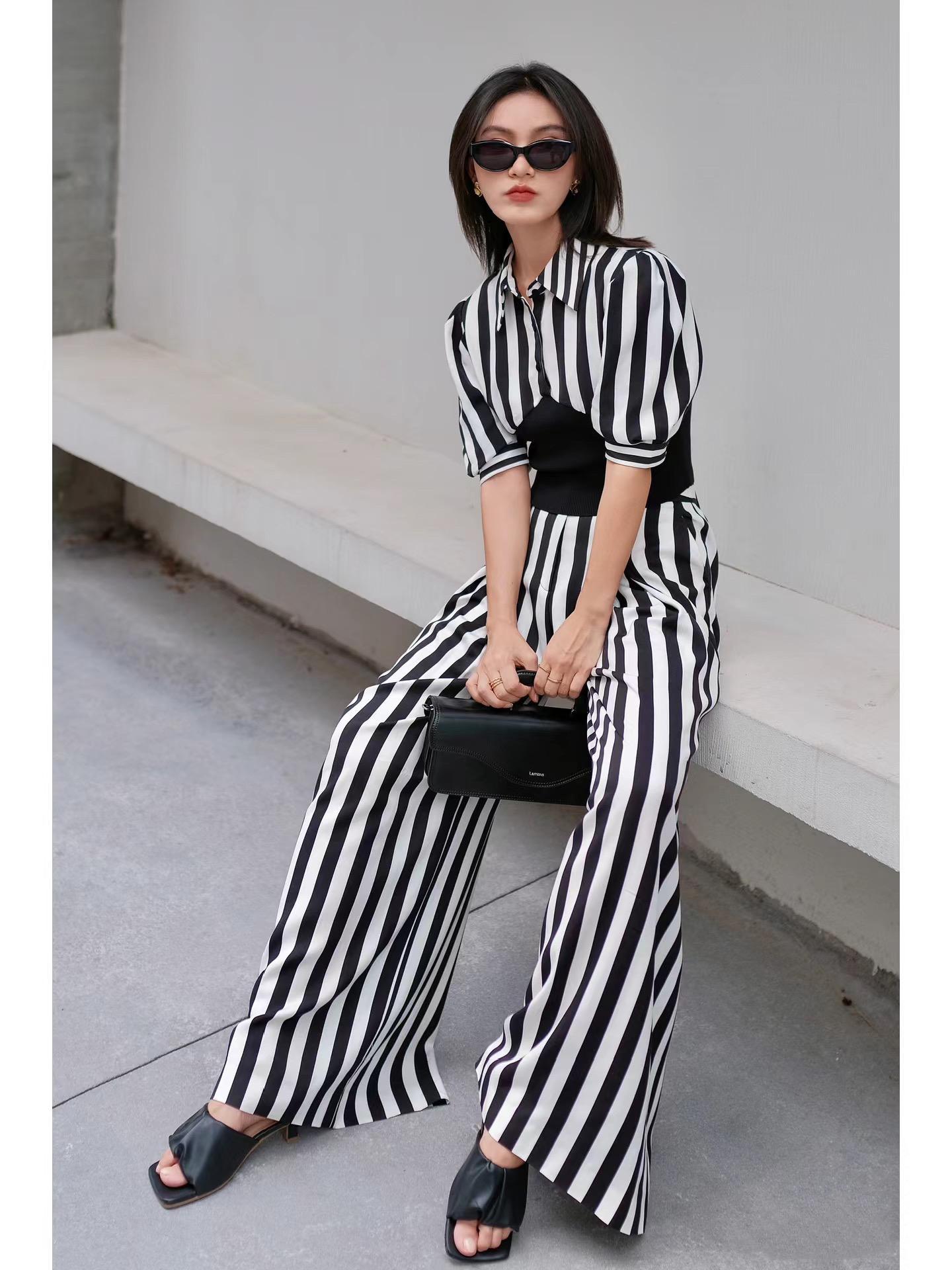 這樣的黑白條紋連體褲,自然是與黑色手拿包、黑色墨鏡更配。