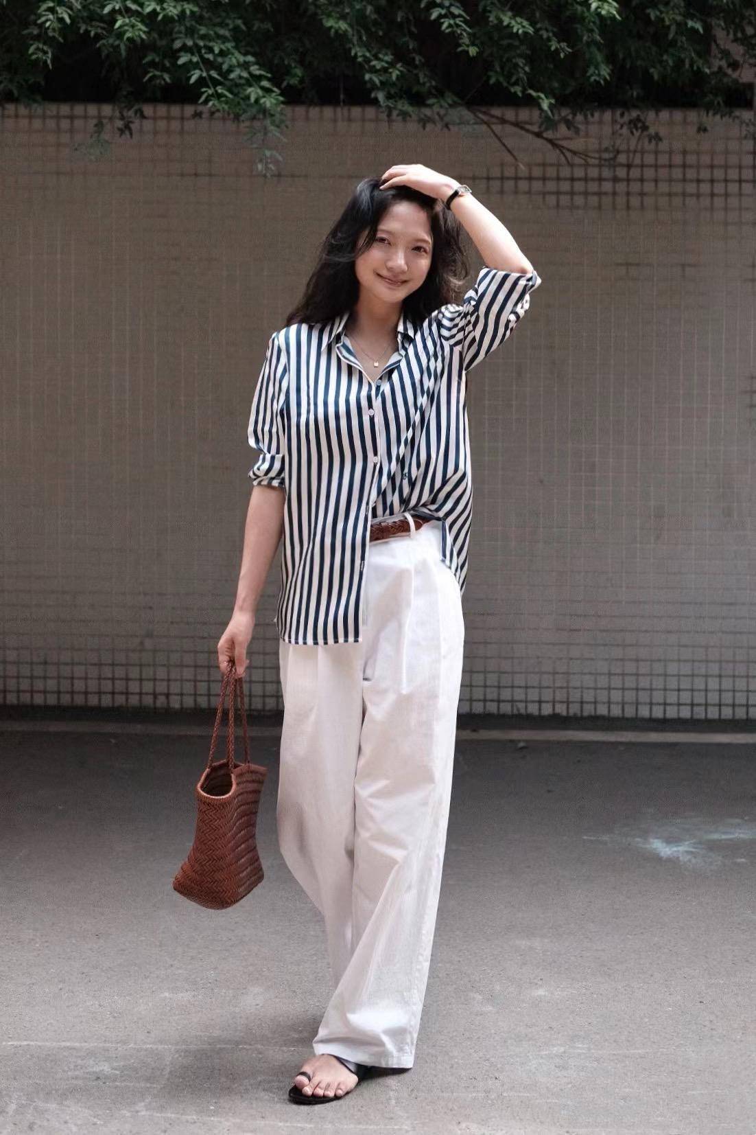 條紋襯衫的穿搭,也相對簡單。
