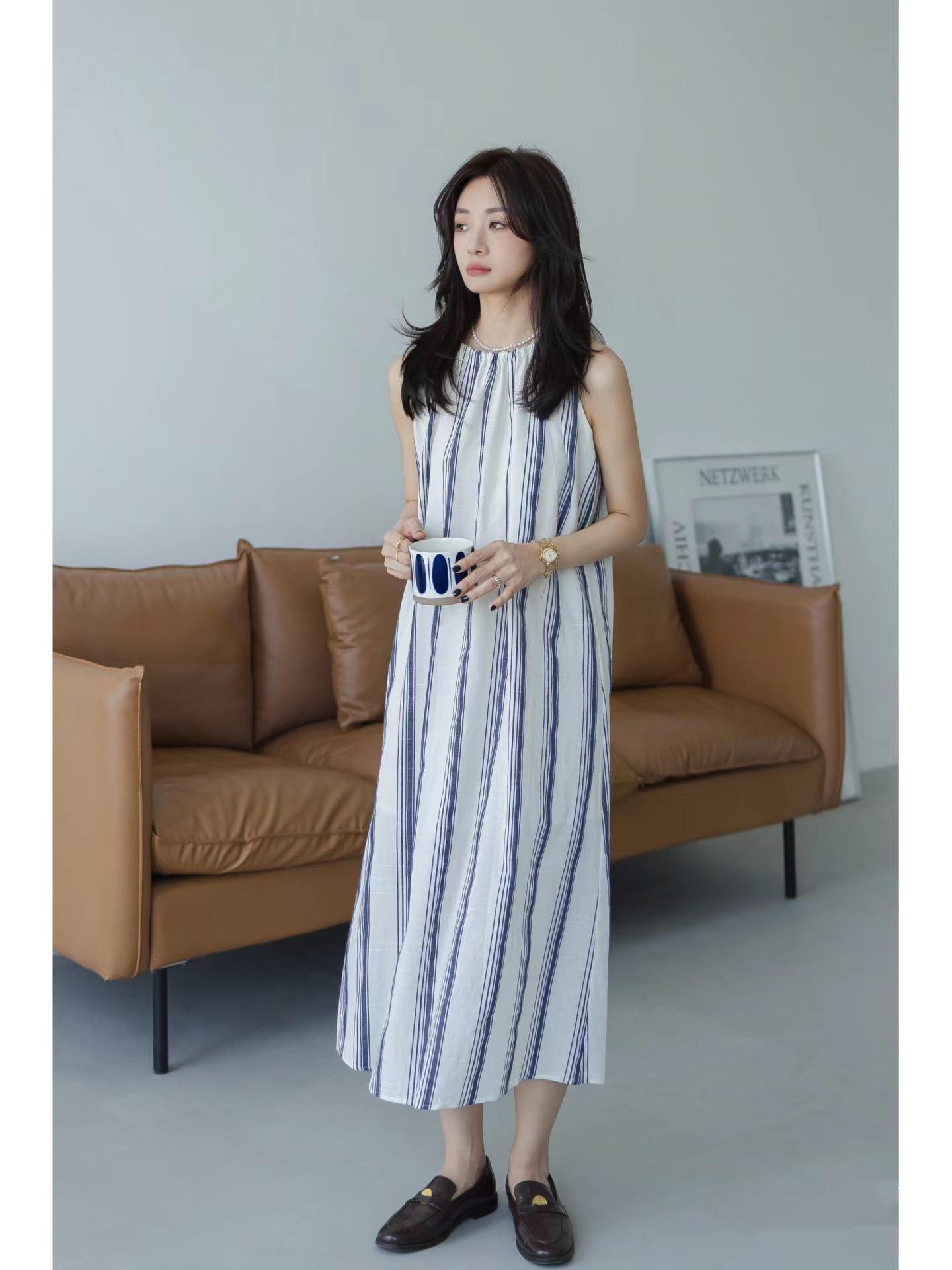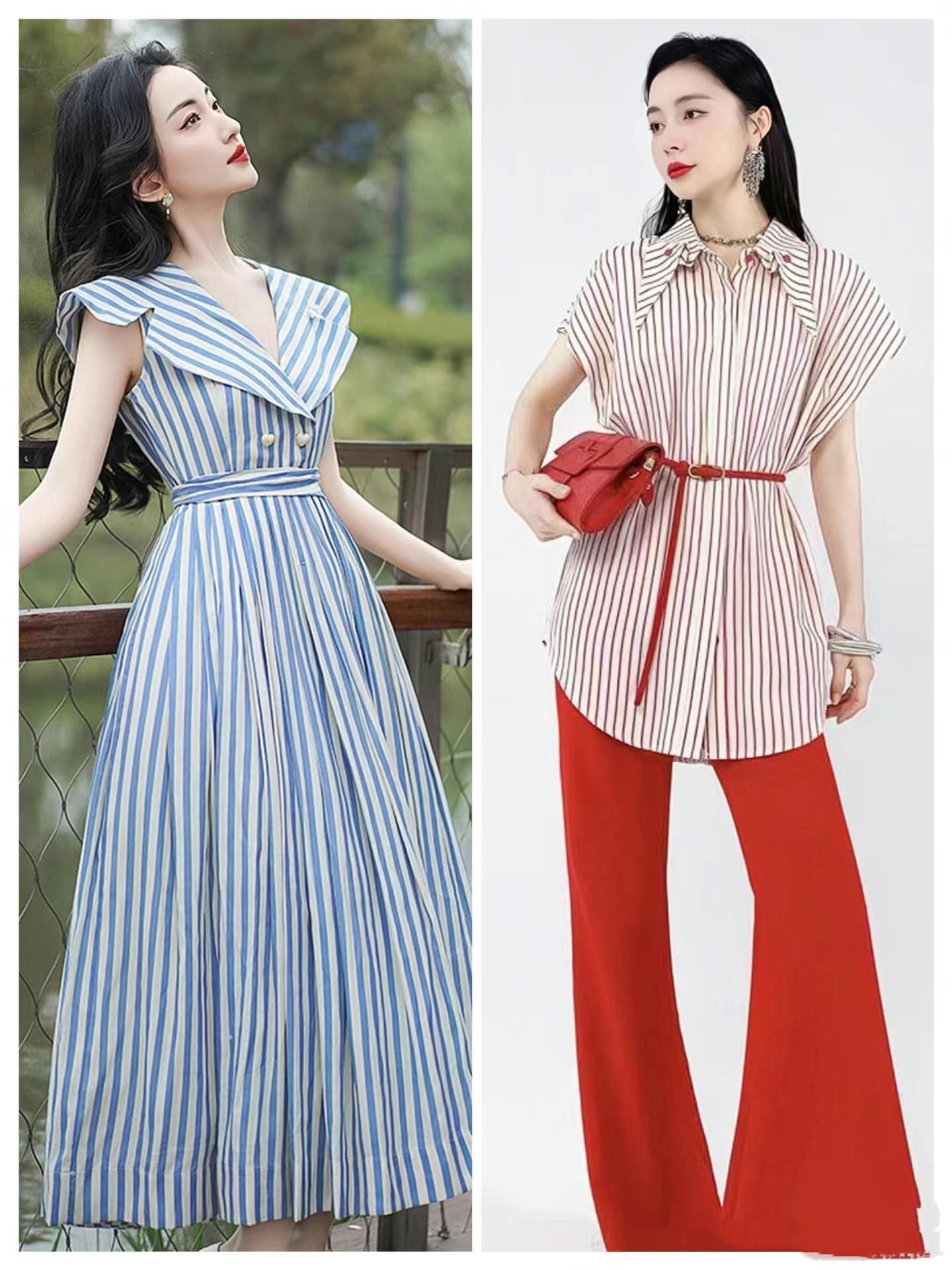 清冷、乾淨、又醒目的藍白條紋連衣裙,法式翻領+高收腰,好有女神範。