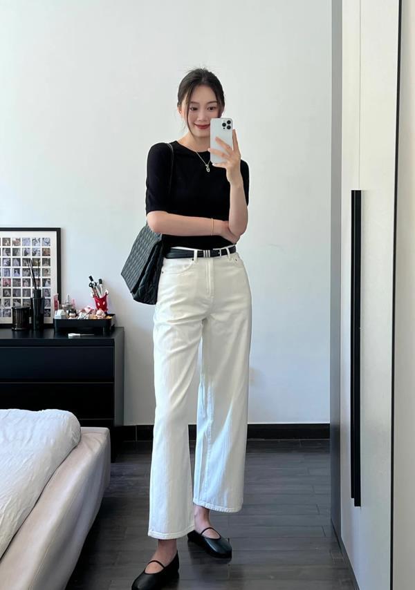 高級感的盡頭就是極簡風,黑白配色的穿搭,就是怎麼看都不覺得膩,也不容易出錯,白色九分直筒褲,這個長度,可以很好把腿部線條拉得很修長,搭配起黑色短袖t恤,另外,將t恤塞進褲子裏面,然後用腰帶進行裝飾,既修飾了整個身材比例,又塑造了完美的身段。