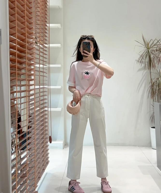 30+姐姐也適合的減齡穿搭,粉嫩顏色的短袖t恤,胸前還有個草莓圖案,這個低飽和度的粉色,可太顯嫩了,很襯膚色。搭配白色九分直筒褲,真的非常顯瘦,也能把腿部襯托得很筆直,腳下踩着的粉色運動鞋,和t恤顏色進行了呼應,太時髦好看了。