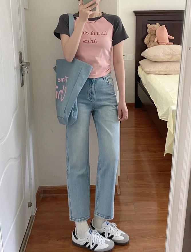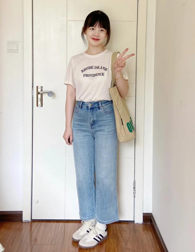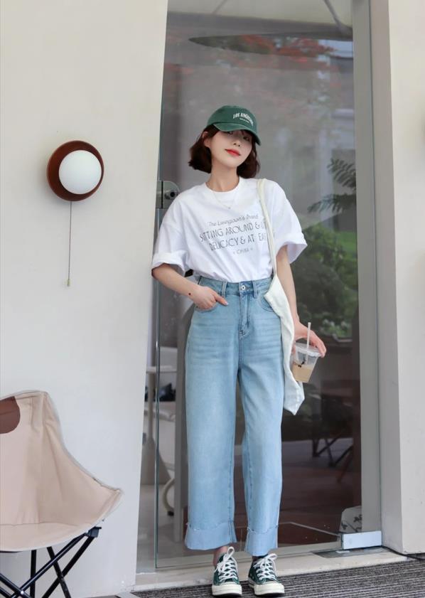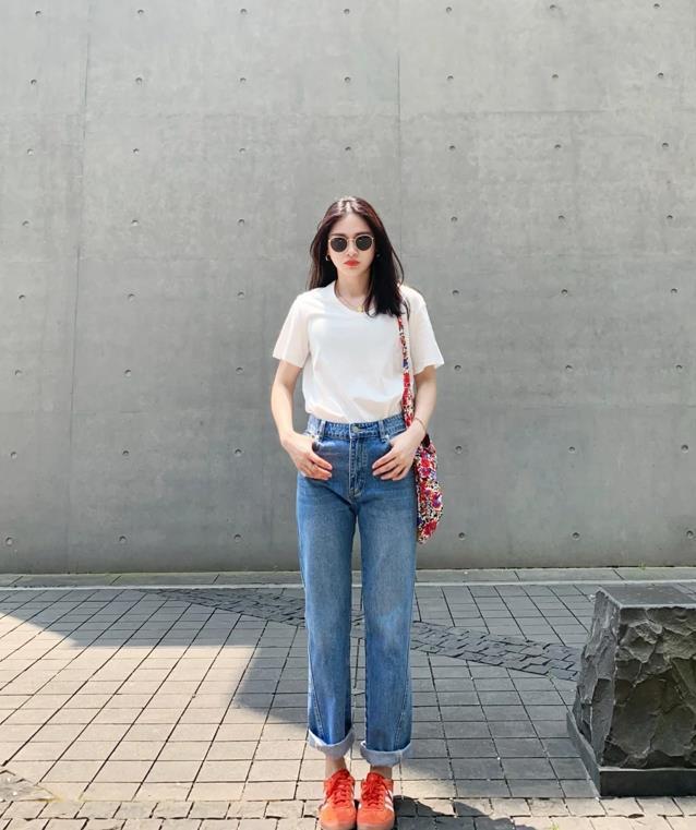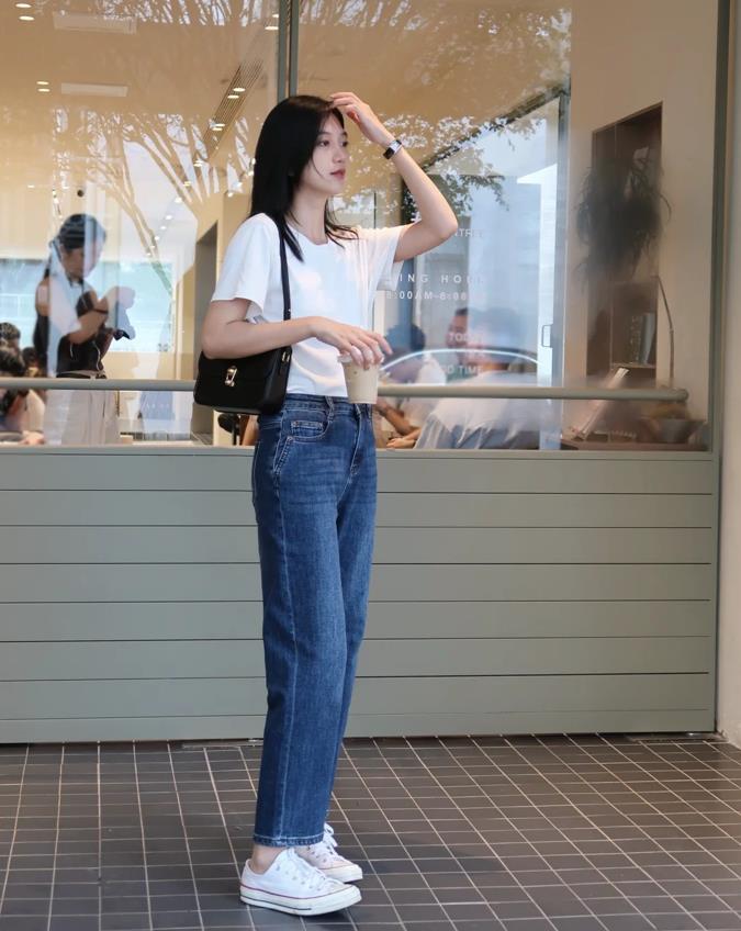 乾淨的白色t恤,可是最不挑人的了,很顯基礎款的款式,怎麼搭配都不容易出錯,選擇一條牛仔直筒九分褲來配,腳下再踩着一雙紅色運動鞋,真的是越簡單越好看,對於小個子女生來說,這樣的搭配可是很合適的,輕鬆顯高挑。