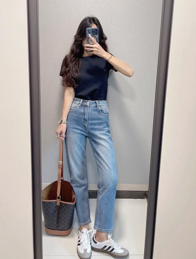 這就是夏天的鬆弛感,相信很多姐妹們都會喜歡的吧?基礎簡約白色短袖t恤,真的最不挑人了,也非常百搭。搭配起九分牛仔直筒褲,在這麼一條褲子的襯托下,可顯腿直了,而且,還將腰線提高起來,能讓下身比例變得更修長。