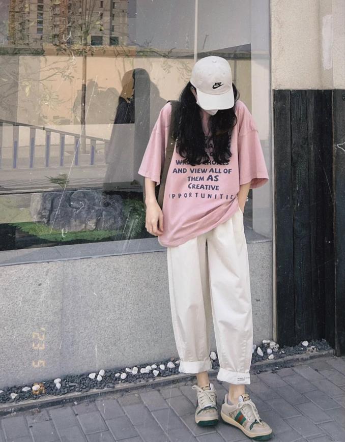 休閒又舒適的一套穿搭,整體的風格看起來是有些顯隨性的,粉色字母t恤+米白色九分褲,很乾淨耐看還不失日常。T恤的面料很柔軟舒服,夏天穿起來很合適,褲子的版型對身材包容性極佳,梨形身材女生們放心衝吧!