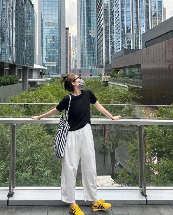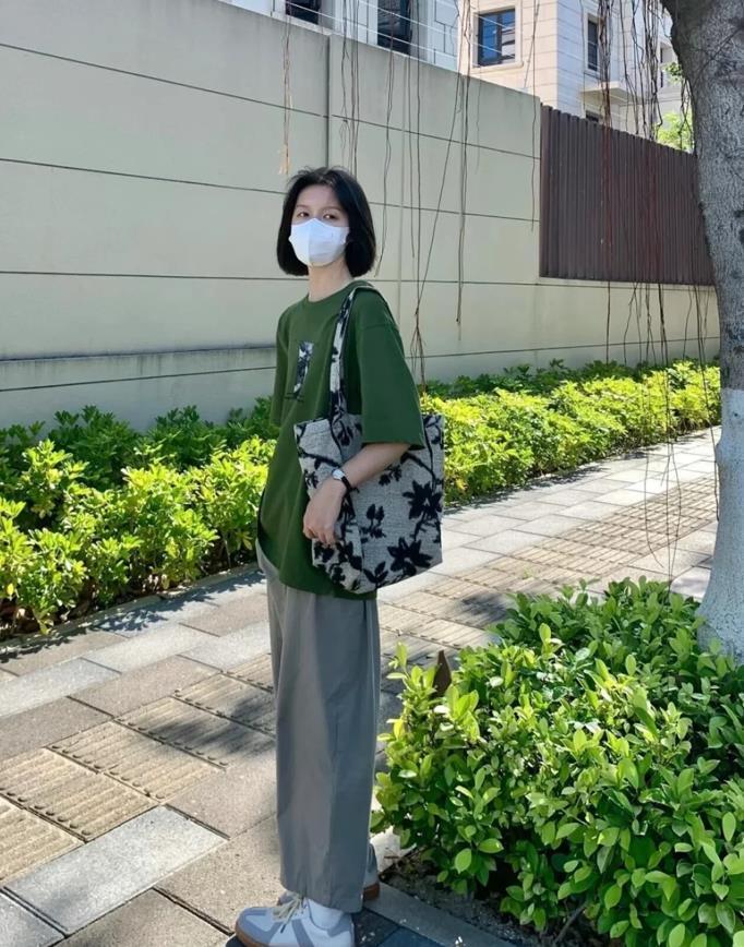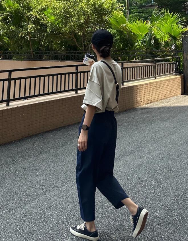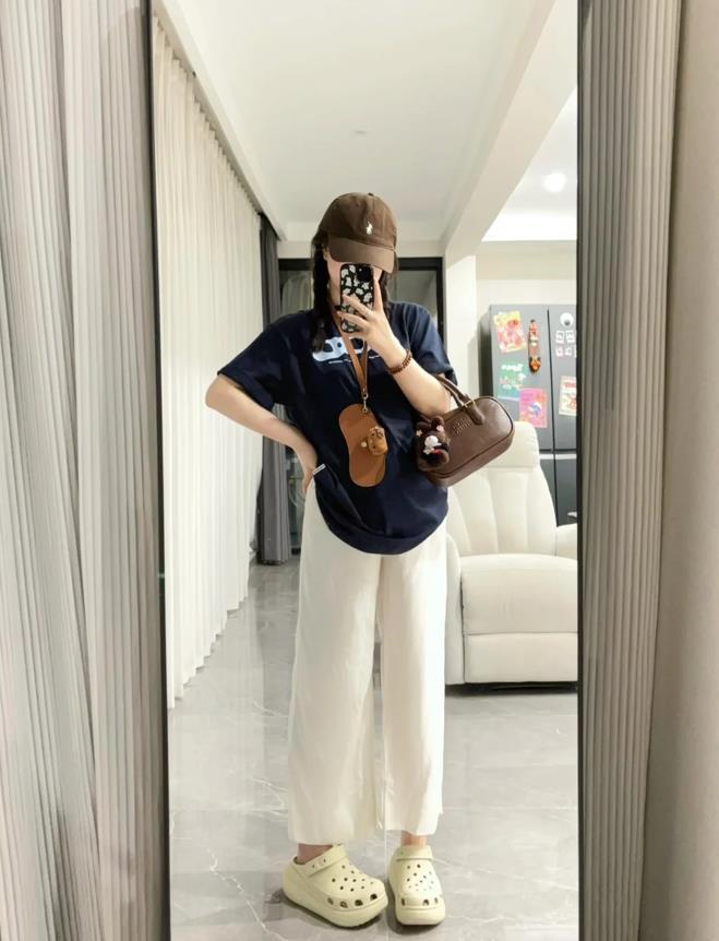 藏藍色的短袖t恤+白色九分褲,這樣的配色組合,看起來就很清爽時髦,上下都是寬鬆的版型,對身材有着極佳的包容性,顯瘦效果極佳的。九分的褲子長度,微微露出腳踝來,視覺上能很好拉長腿部線條。出門隨便踩着一雙涼拖鞋就很好看。