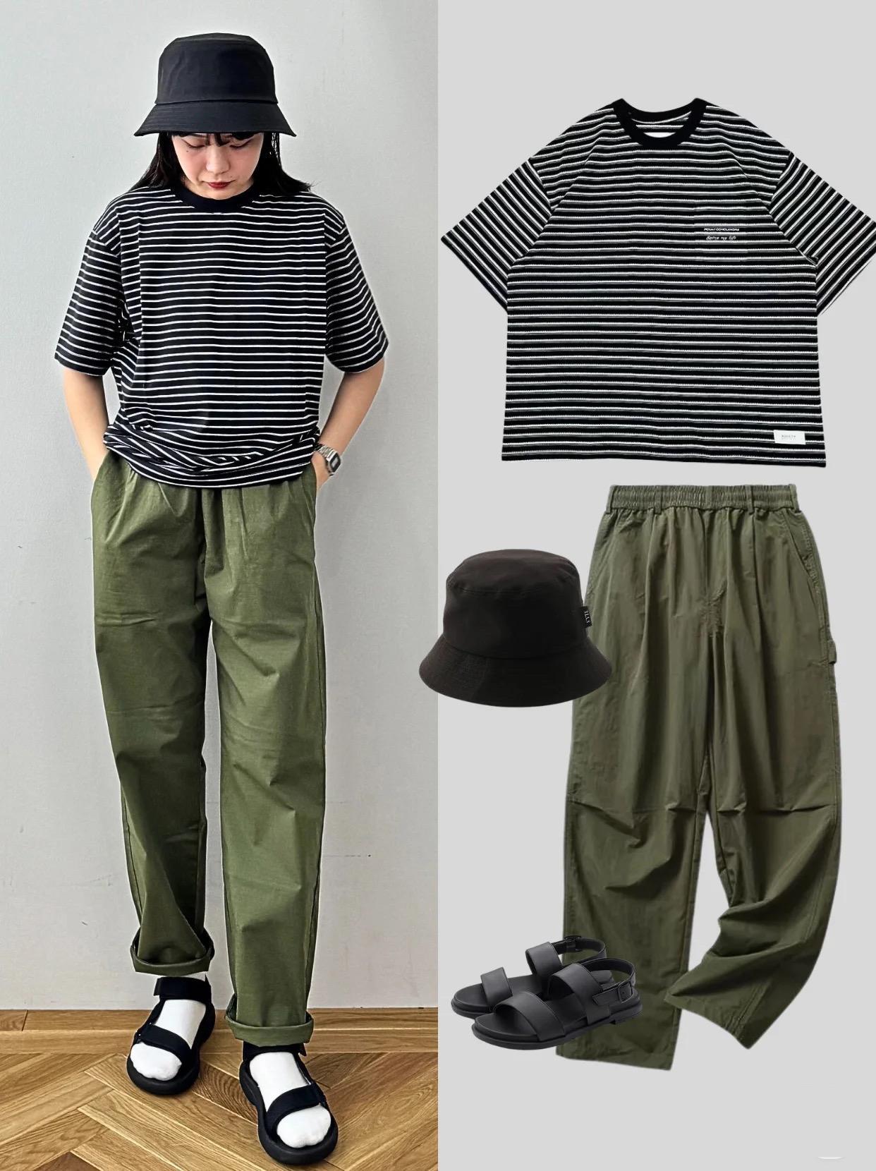 酷颯一點的穿搭,上班通勤也可以安排起來呀。纖細的條紋T恤,可以配軍綠色的長褲,看似簡單實則更加酷颯。軍綠色長褲,配上卷邊設計,更加的利落。
