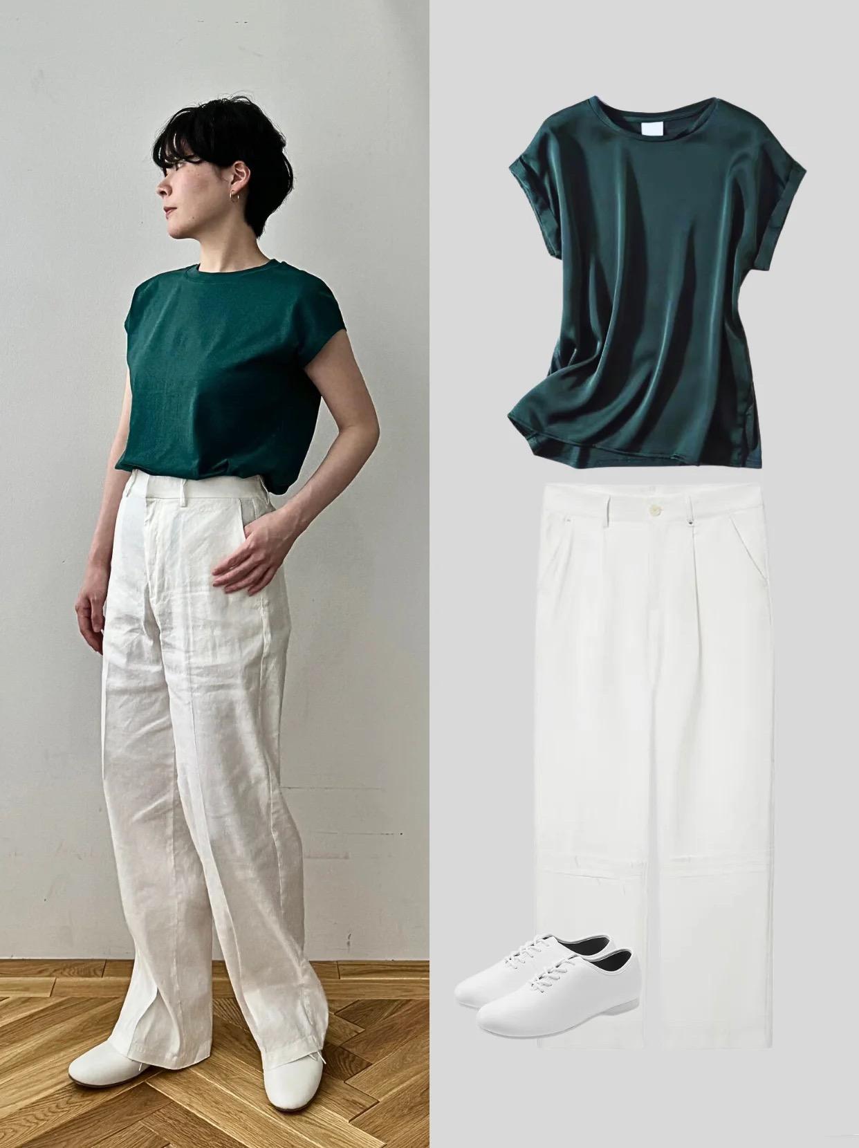 墨綠色的T恤,帶有小收腰的設計,視覺上顯白又顯貴。配白色的直筒褲,帶來夏日清爽,可以讓我們的穿搭更利落流暢。