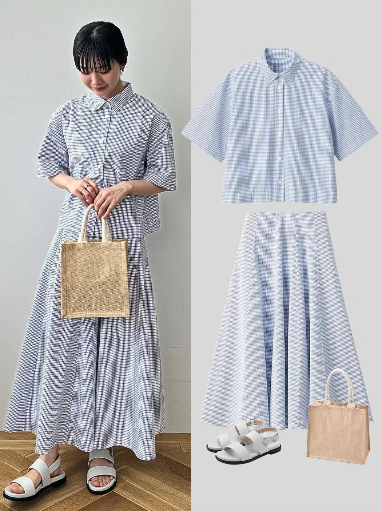 淺藍色的格子套裙,有一種更溫柔減齡的效果。細細的千鳥格,不像純色一般乏味、又更加素雅文藝。配白色涼鞋,視覺上也更加的清爽溫柔。想要更年輕一點,上班就選擇這一種淺藍色的套裙吧。