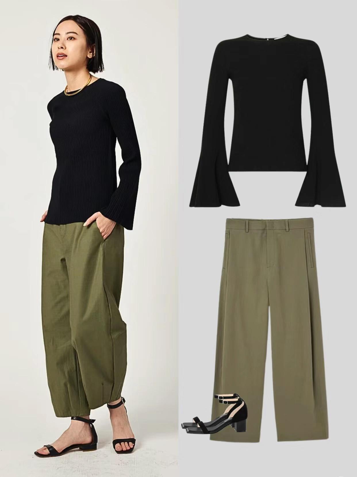 想要上半身更顯瘦,就選擇黑色的上衣吧。黑色喇叭袖的上衣,配上軍綠色的直筒褲,簡單又大氣。深色系穿搭,自帶氣場、適合幹練大方的上班族。