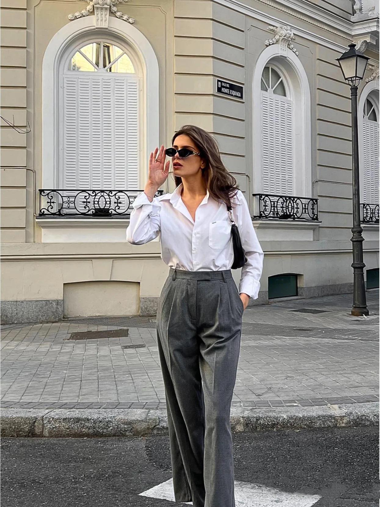 白襯衫、西裝褲,黑灰色的搭配高級酷颯。黑色腋下包、個性的黑超墨鏡,讓通勤穿搭不過分的刻板,更多了幾分酷颯洋氣。