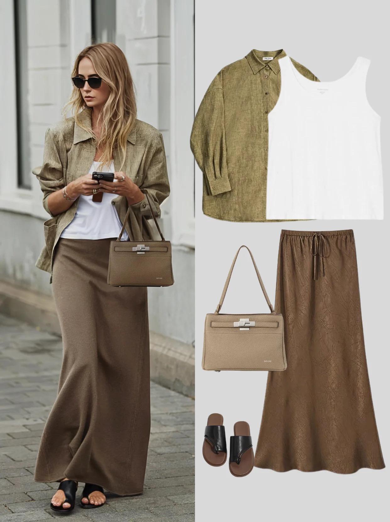 牛仔襯衫、高腰半身裙,簡約又顯瘦的穿搭,也非常體面大方。天氣轉涼的時候,還可以配米白色西服外套,清爽又很顯白。